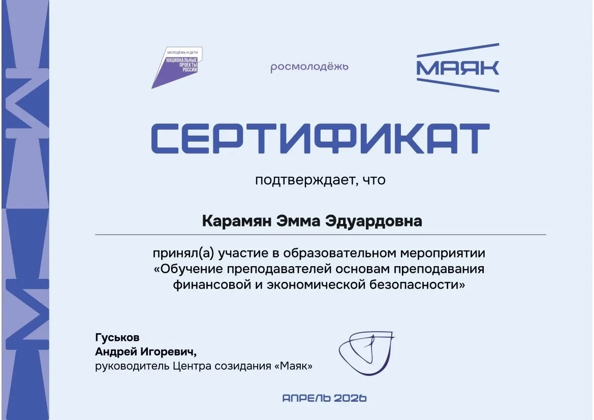 С 14 по 16 апреля 2026 года старший преподаватель кафедры сервиса и гостиничного дела ФГБОУ ВО «Донецкий национальный университет экономики и торговли имени Михаила Туган-Барановского» Карамян Эмма Эдуардовна приняла участие в мероприятии «Обучение молодых преподавателей основам преподавания финансовой и экономической безопасности».